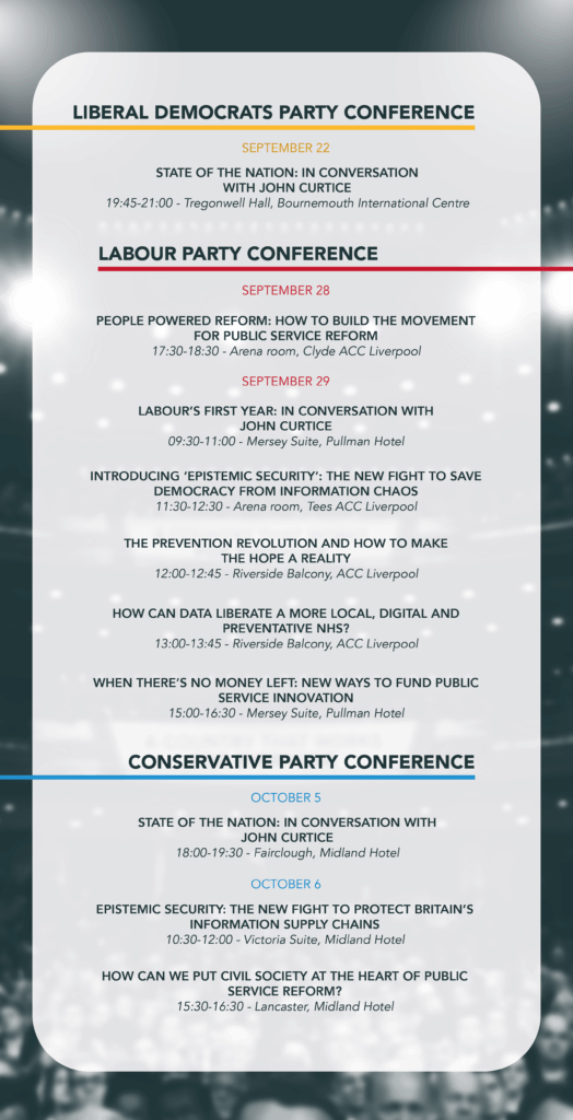 Across Labour, Conservative and Lib Dem Party Conferences we’ll explore public service reform, public health, Labour’s first year in government and threats to Britain’s information supply chains.