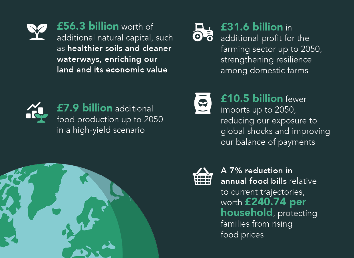 The evidence set out in this report shows that scaling sustainable farming could deliver powerful dividends far beyond the agricultural sector. Alongside its extensive environmental benefits, it can strengthen our economic security, national food security, and household food security. Our modelling shows the scale of this opportunity is substantial: